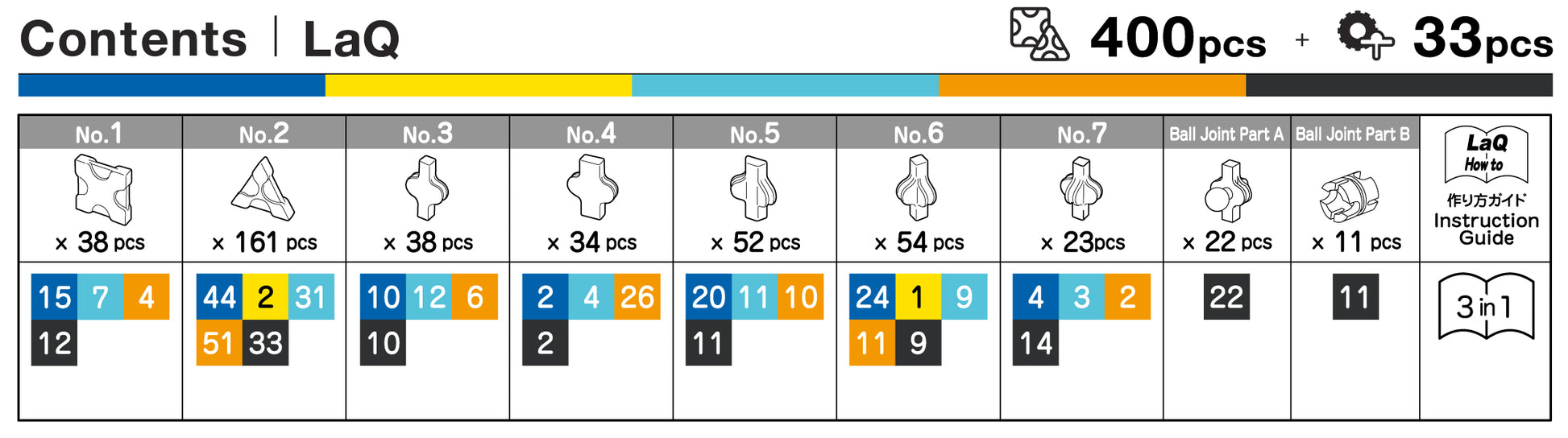 400 normal parts and 33 special parts are included in the package. The enclosed guide provides instructions for 3 models you can build. Recommended for ages of 7 and above. Made in Japan. SNAP! CLICK! and CREATE!