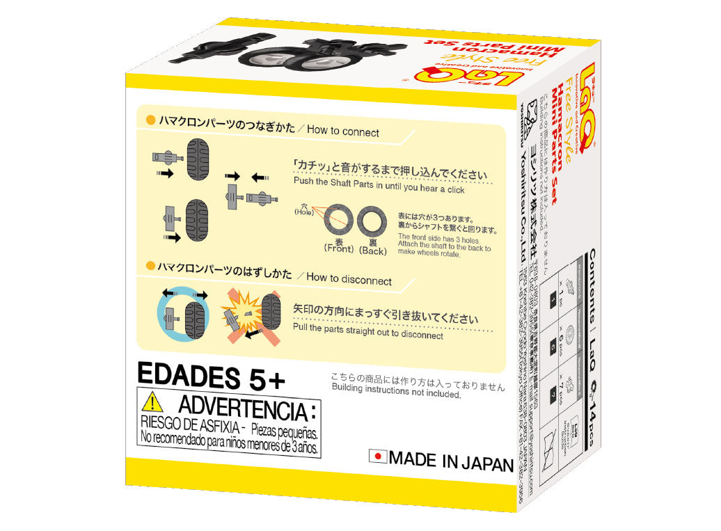 This set contains 6 Hamacron Mini Wheels, 7 Hamacron Mini Shafts, and 1 Hamacron Shaft. There are no instructions included in this package. Recommended for ages 5 and above. SNAP! CLICK! and CREATE!