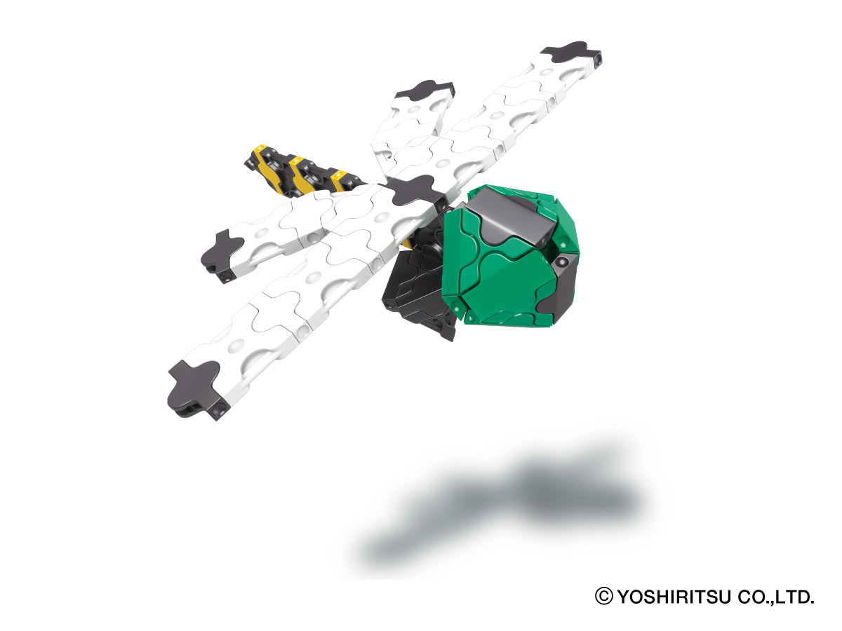 65 normal parts are included in the package. The enclosed guide provides instructions for the Mini Jumbo Dragonfly you can build. Recommended for ages of 5 and above. Made in Japan. SNAP! CLICK! and CREATE!