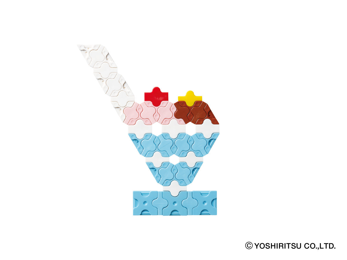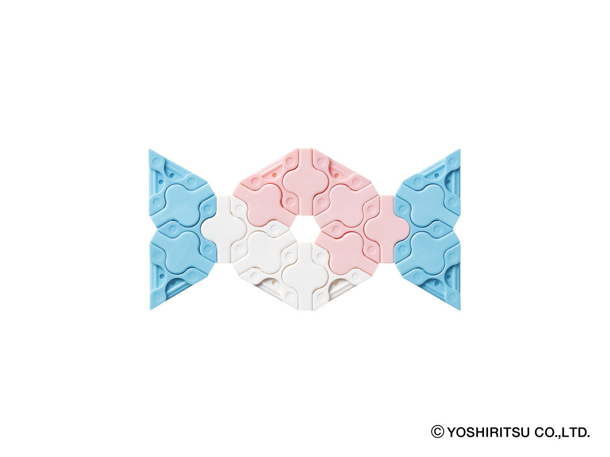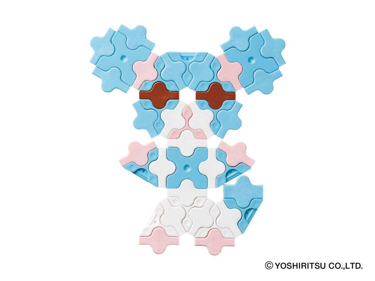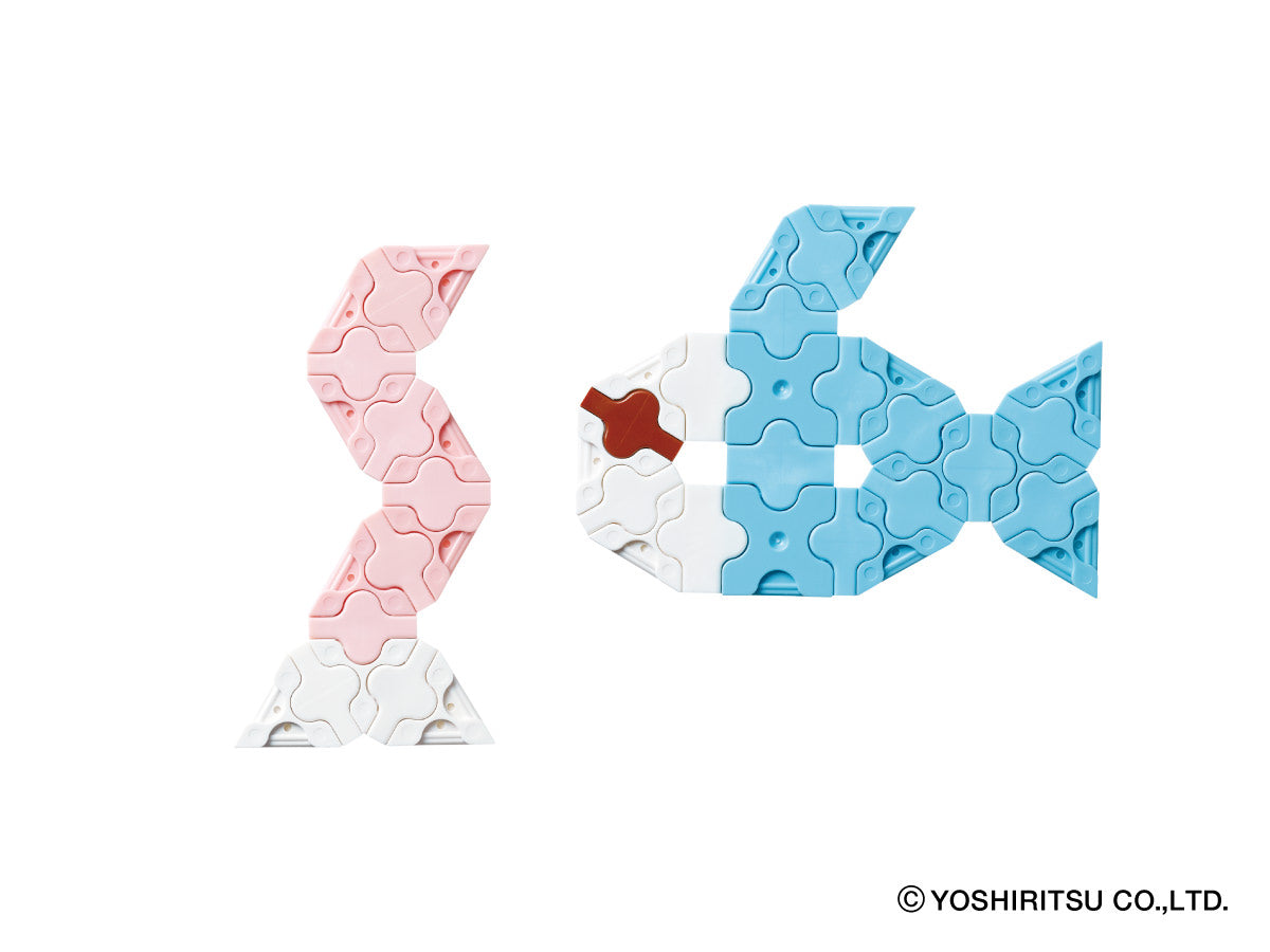 62 normal parts are included in the package. This package features exclusively flat pieces. The enclosed guide provides instructions for 9 models you can build. Recommended for ages of 5 and above. Made in Japan. SNAP! CLICK! and CREATE!