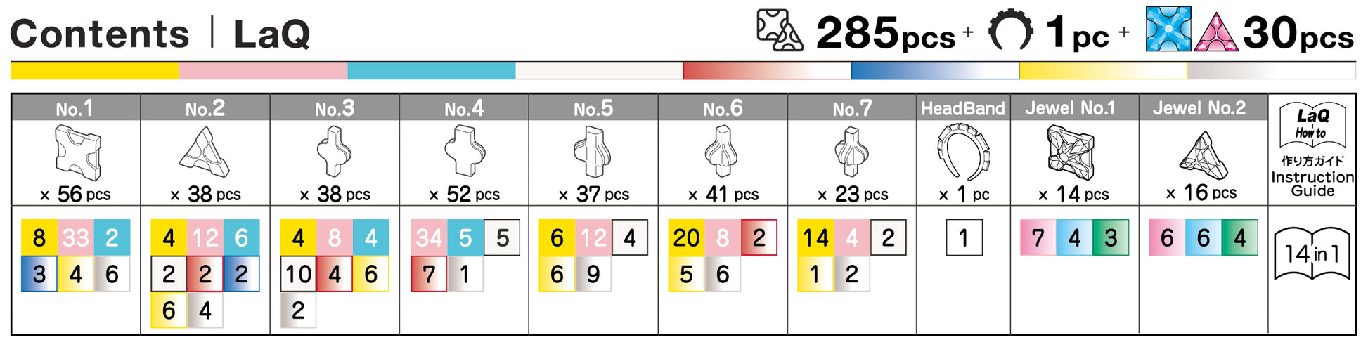 285 normal parts and 31 special parts are included in the package. The enclosed guide provides instructions for 14 models you can build. Recommended for ages of 5 and above. Made in Japan. SNAP! CLICK! and CREATE!